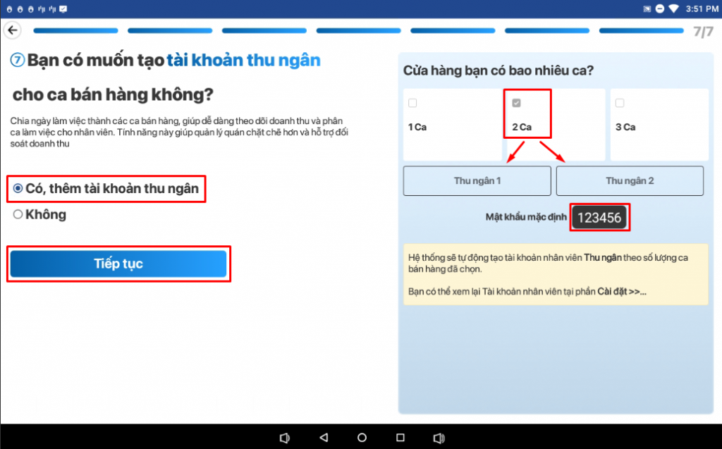 Chọn số lượng ca bán hàng mà bạn muốn tạo ở màn hình phải, hệ thống sẽ tự động tạo số lượng tài khoản tương ứng (Tài khoản sẽ hiển thị sẵn ở màn hình đăng nhập tài khoản cho bạn chọn, mật khẩu mặc định là 123456).