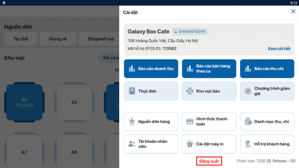 Tại giao diện màn hình bán hàng → Chọn Cài đặt ở góc phải màn hình → Nhấn  Đăng xuất