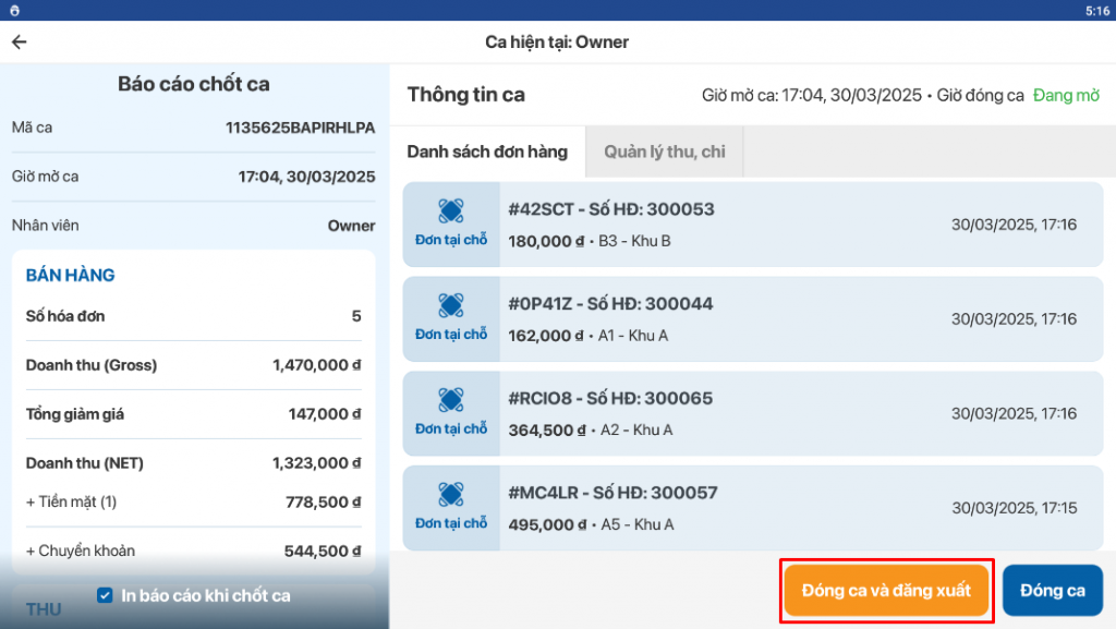 Tại giao diện màn hình bán hàng → Chọn Ca hiện tại → Nhấn Đóng ca và đăng xuất