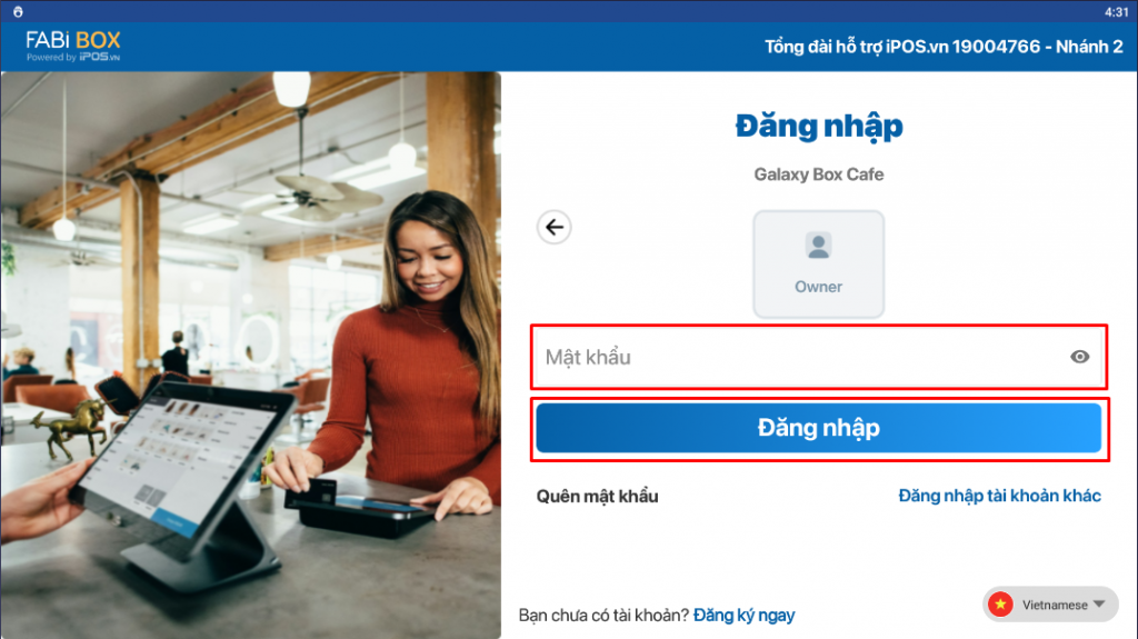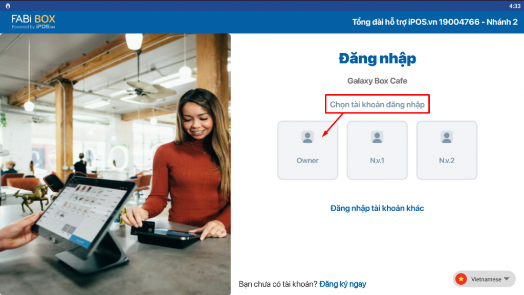 • Phần mềm sẽ hiển thị sẵn tài khoản Chủ cửa hàng và tài khoản nhân viên cho bạn chọn