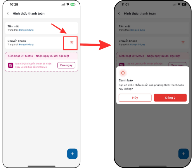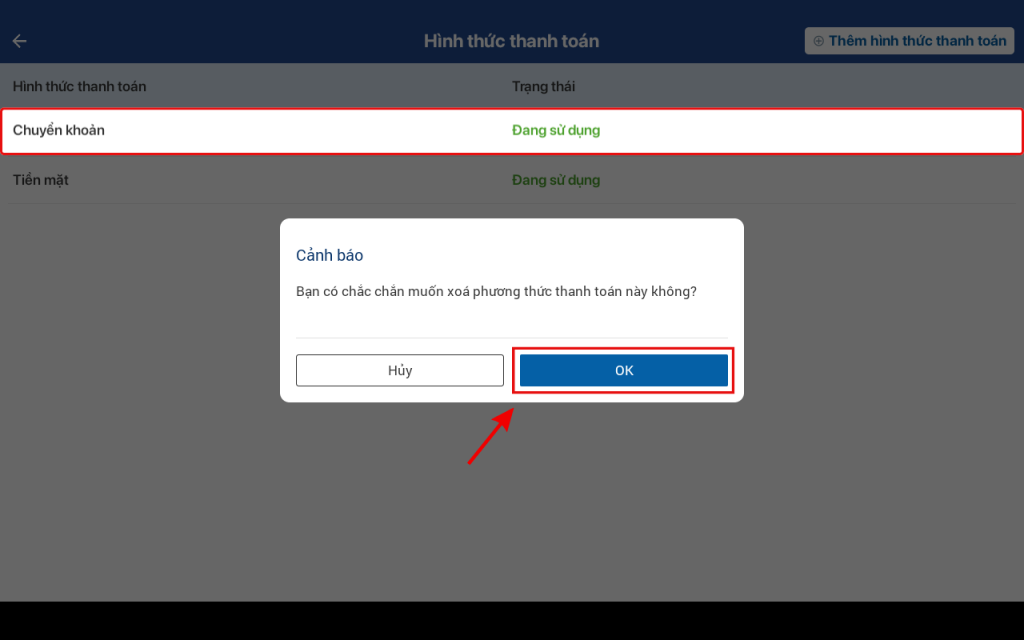 Bấm biểu tượng Xóa tại hình thức thanh toán muốn xóa → Nhấn Đồng ý để xác nhận xóa