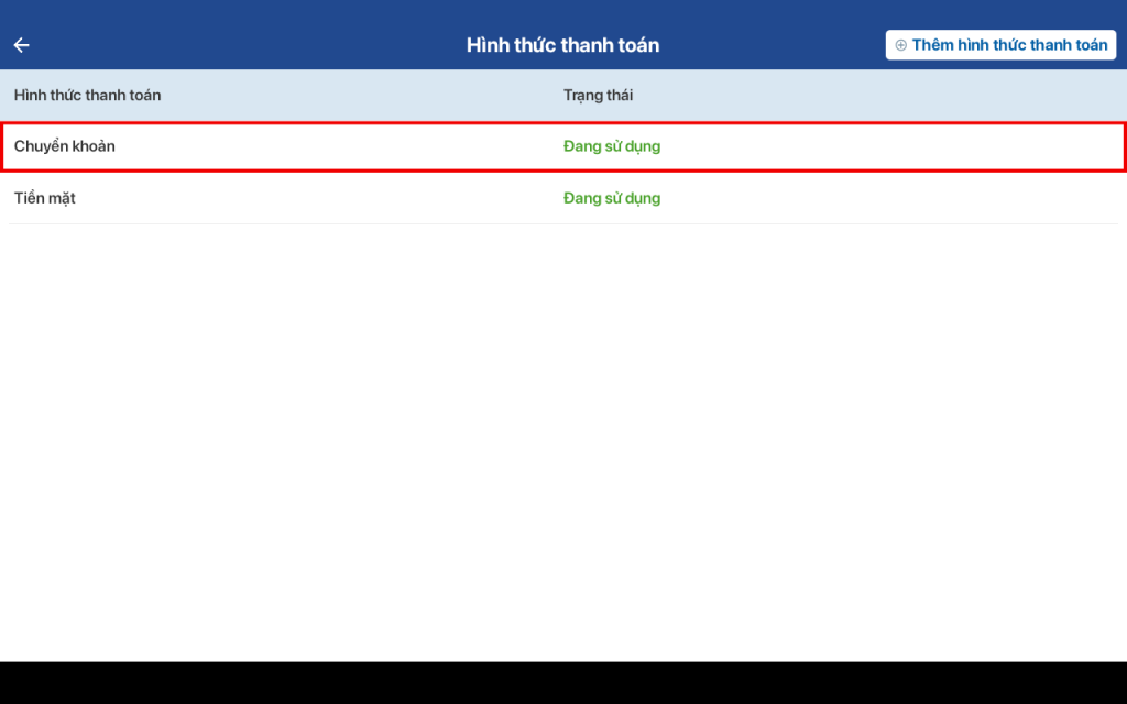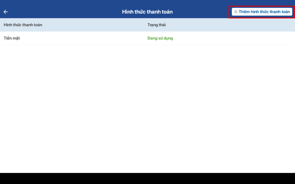 Nhấn biểu tượng dấu cộng góc phải màn hình để Thêm mới hình thức thanh toán
