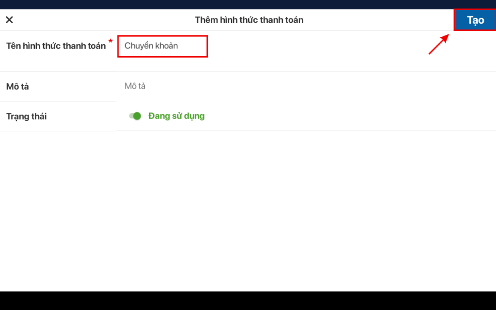 Nhập tên Hình thức thanh toán → Bấm Tạo