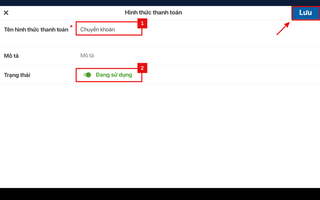 Điền các thông tin để tạo mới hình thức thanh toán → Bấm Lưu