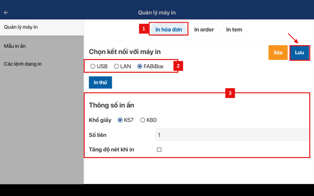 - Chọn kết nối với máy in FABiBox1 → Nhấn Lưu