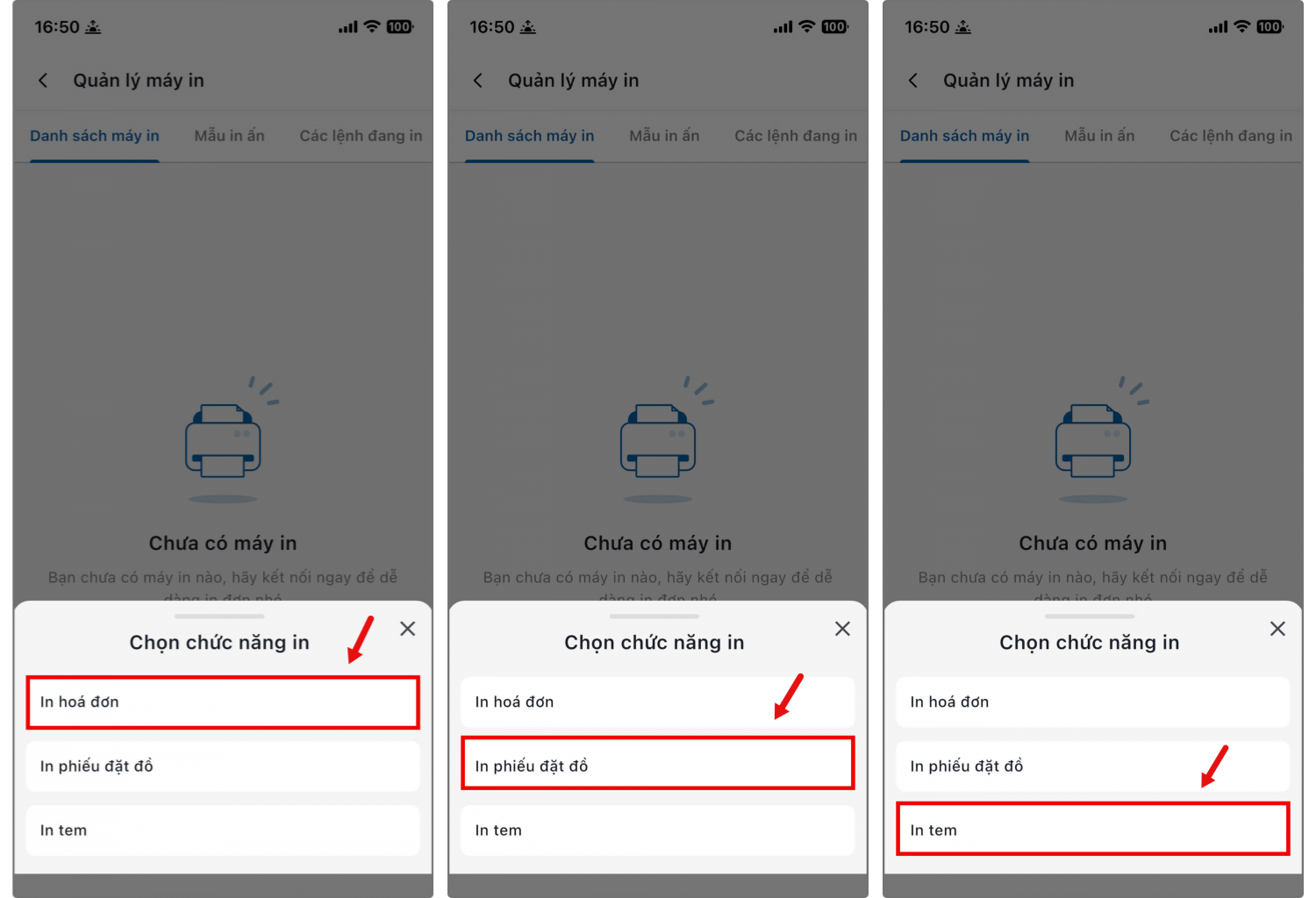 Bước 1: Tại giao diện Cài đặt → Cài đặt máy in → Chọn loại máy in “In order“