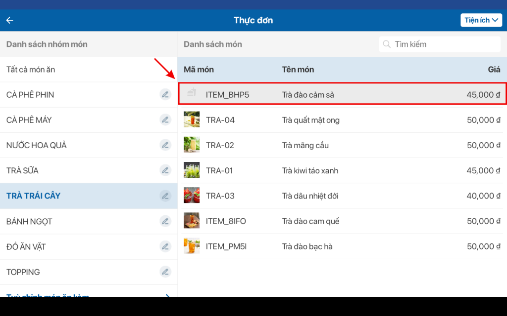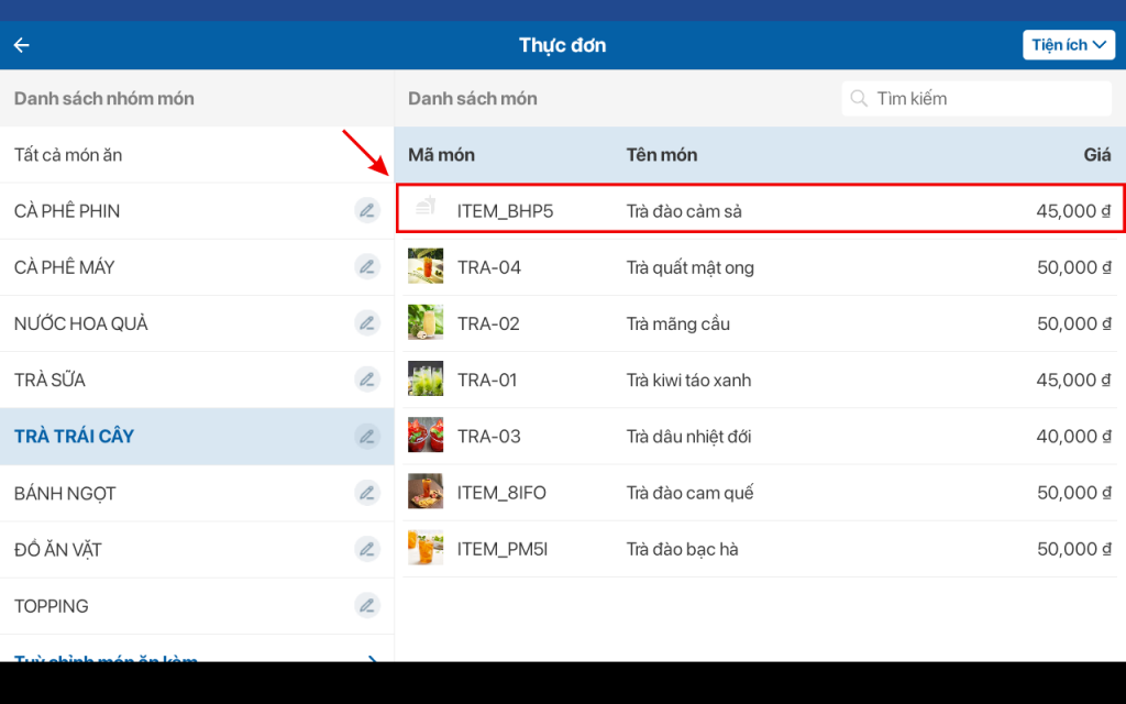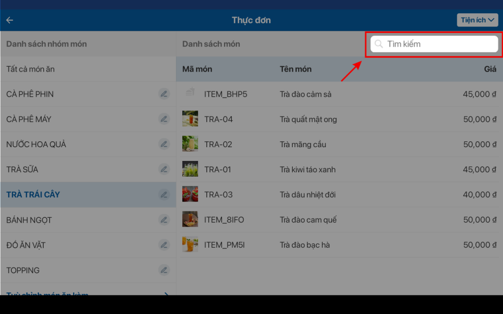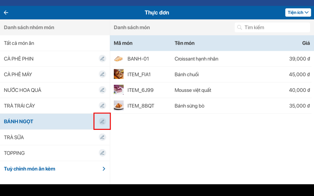 Trong giao diện Thực đơn → Chọn nhóm món → Nhấn vào biểu tượng (chưa chèn đc)