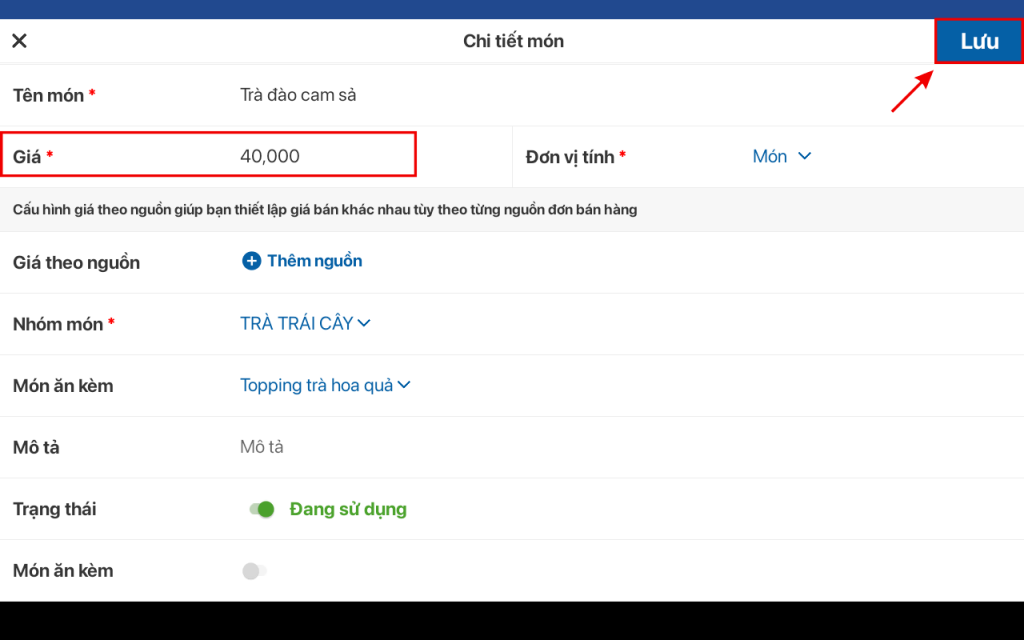 Bước 2: Chỉnh sửa thông tin món → Bấm Lưu