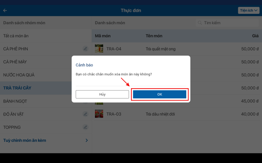 Tại giao diện Thực đơn → Chọn và Nhấn giữ món ăn muốn xóa → Bấm OK
