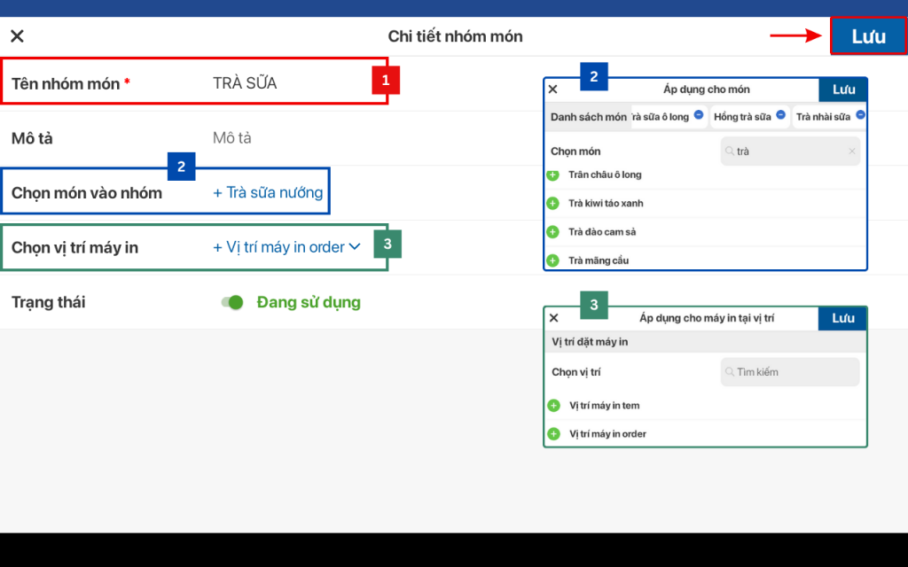 Nhập thông tin Tạo nhóm món → Bấm Lưu
