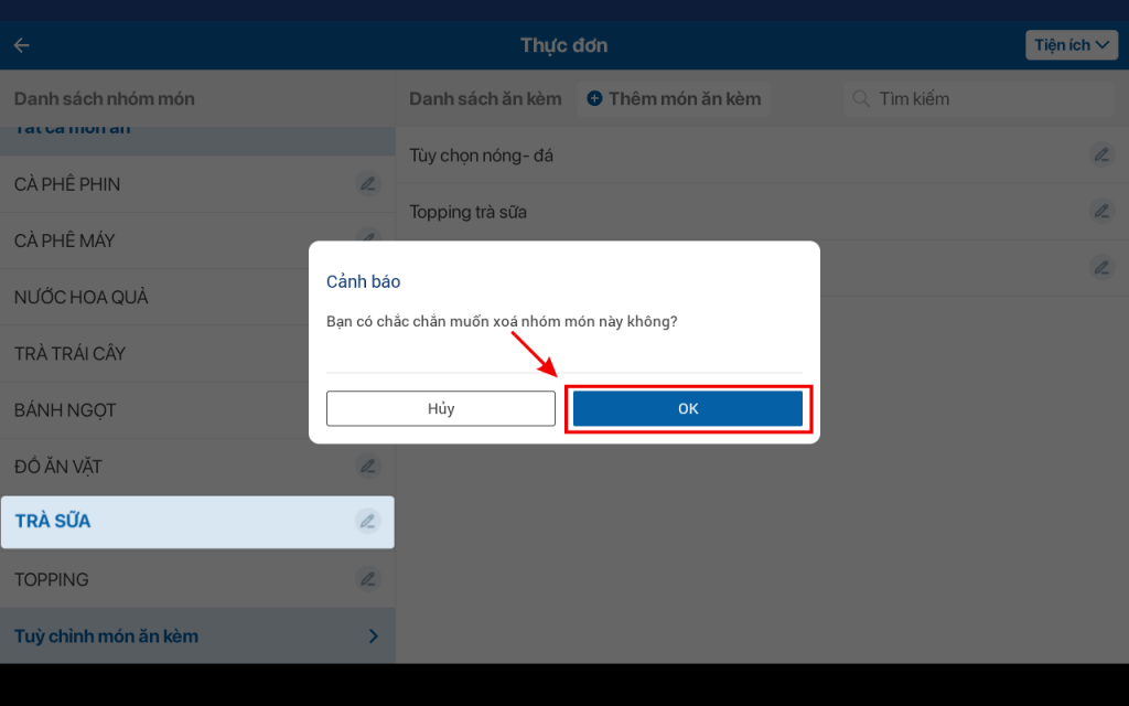 Tại giao diện Thực đơn → Chọn và Nhấn giữ nhóm món muốn xóa → Bấm OK
