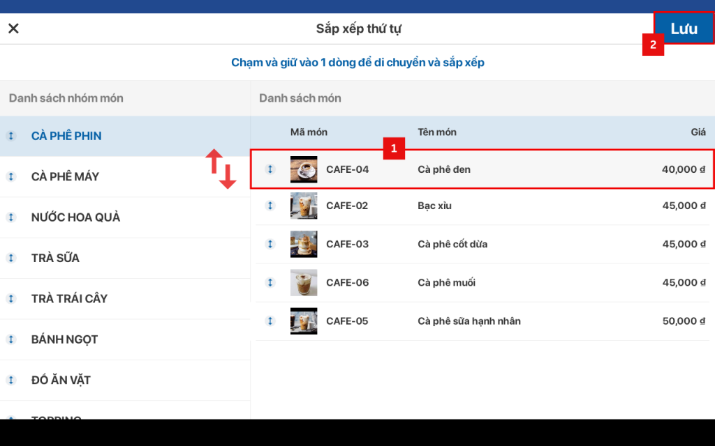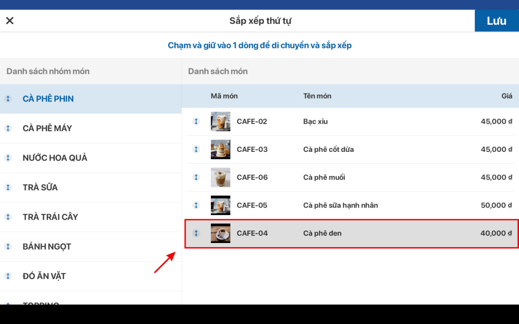 Chọn món ăn cần sắp xếp thứ tự (VD: Cà phê đen,..)
