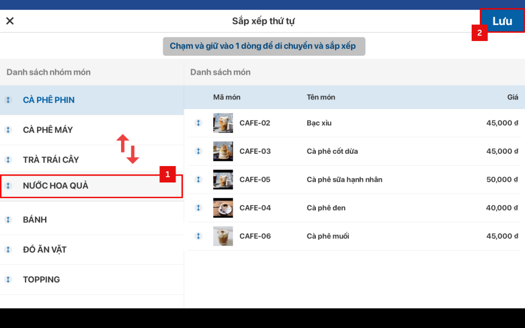 Chọn Nhóm món cần sắp xếp thứ tự (VD: NƯỚC HOA QUẢ,..)