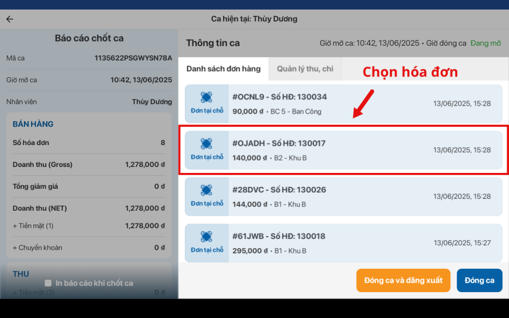Bước 2:Danh sách hóa đơn → Chọn hóa đơn cần thao tác