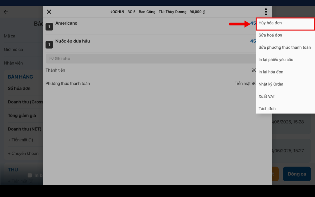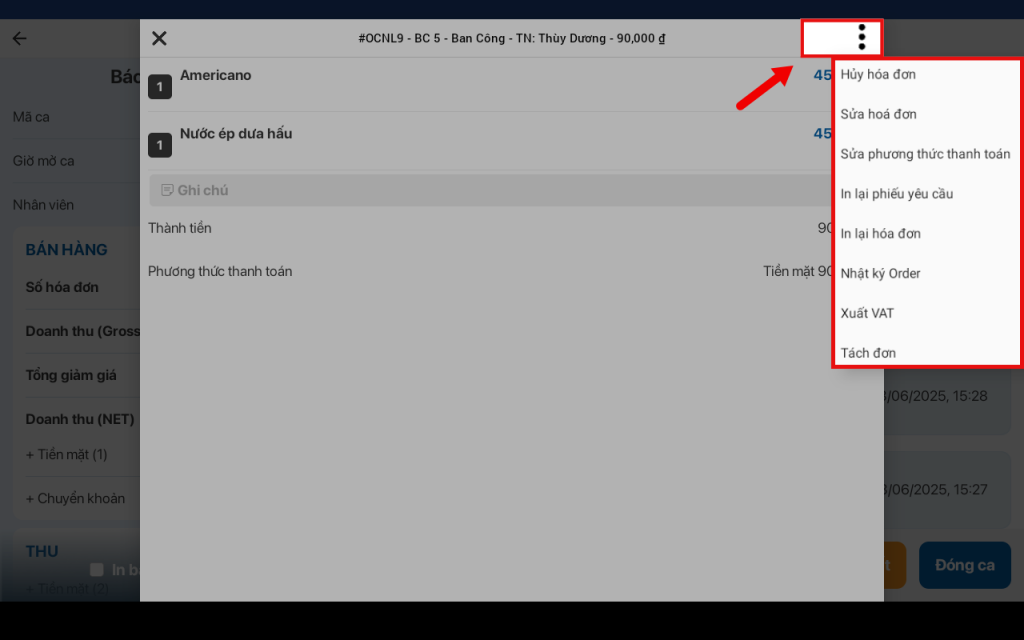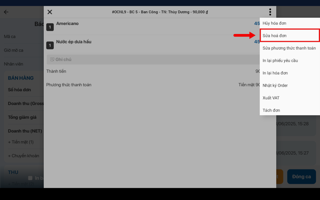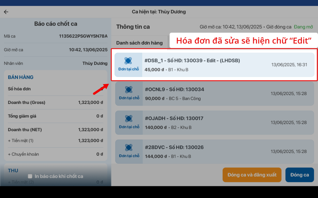 - Xem lại hóa đơn đã sửa tại mục Báo cáo ca bán hàng