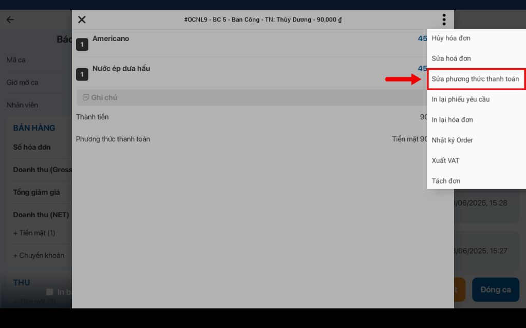 Một trong những lý do thu ngân phải chỉnh sửa hóa đơn nhiều nhất là do chọn sai hình thức thanh toán, tính năng “Sửa phương thức thanh toán” cho phép chủ cửa hàng hoặc nhân viên thu ngân chỉnh sửa nhanh phương thức thanh toán của hóa đơn mà không ảnh hưởng đến các chi tiết khác của hóa đơn.