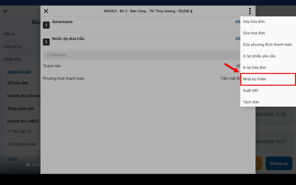Tính năng “Nhật ký gọi món” giúp chủ cửa hàng và nhân viên xem lại toàn bộ lịch sử các thao tác liên quan đến hóa đơn, bao gồm: