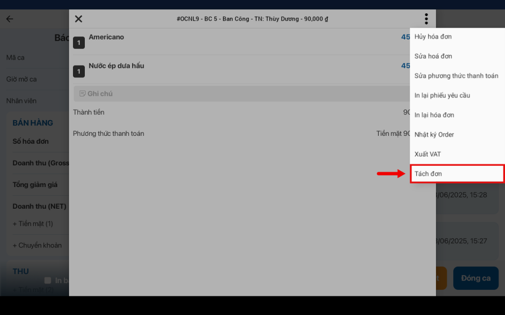 - Tách đơn: Tách hóa đơn để thanh toán