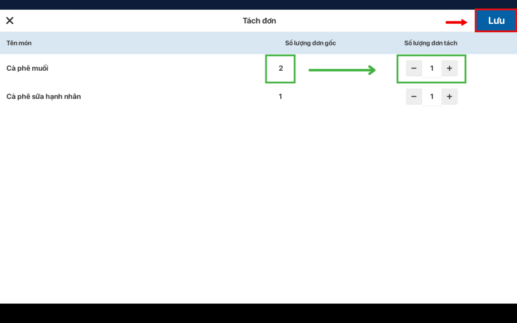 VD: Bạn cần tách đơn sau thành 2 hóa đơn, điều chỉnh số lượng → Bấm Lưu