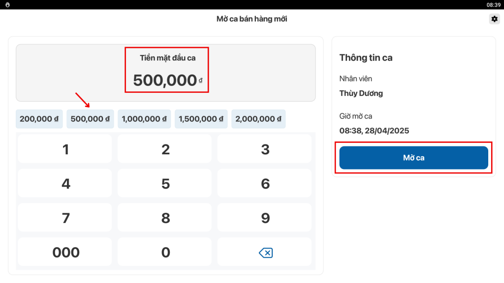 Bước 2: Tại giao diện bán hàng Nhập số dư đầu ca → Nhấn Mở ca  Tiền mặt đầu ca: Số tiền mặt được chuẩn bị sẵn để trả lại khách hàng khi thanh toán đầu ca bán hàng hoặc số tiền mặt bàn giao từ ca bán hàng trước đó