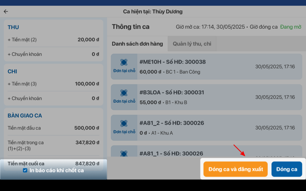 Bước 2: Nhấn Đóng ca hoặc Đóng ca và đăng xuất để đóng ca bán hàng hiện tại