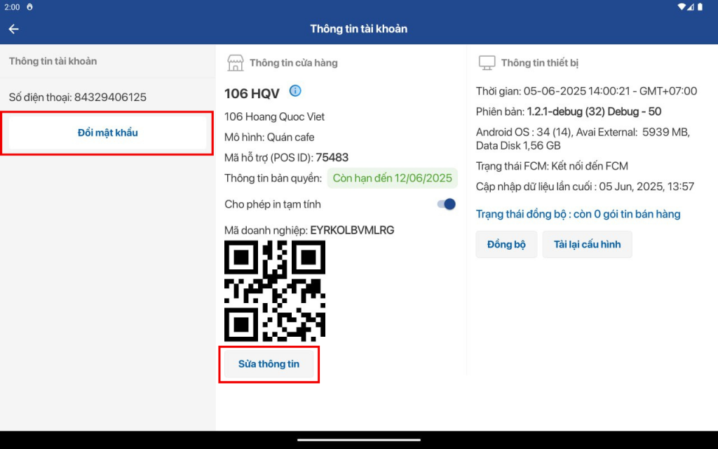 - Sửa thông tin cửa hàng: Tên, địa chỉ cửa hàng (hiển thị trên hóa đơn bán hàng)