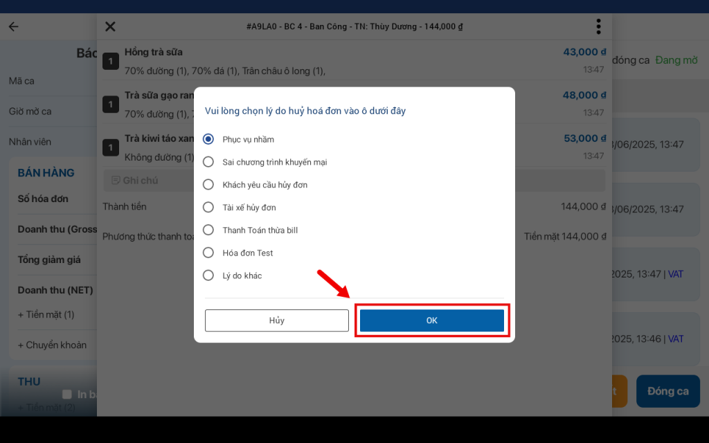Xem lại hóa đơn đã sửa tại mục Báo cáo ca bán hàng