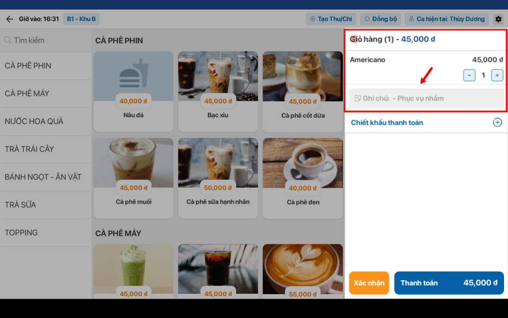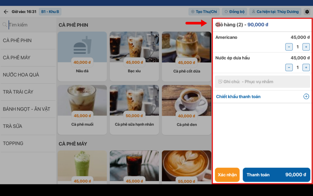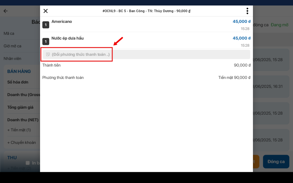 Tại giao diện bán hàng → chọn Ca hiện tại