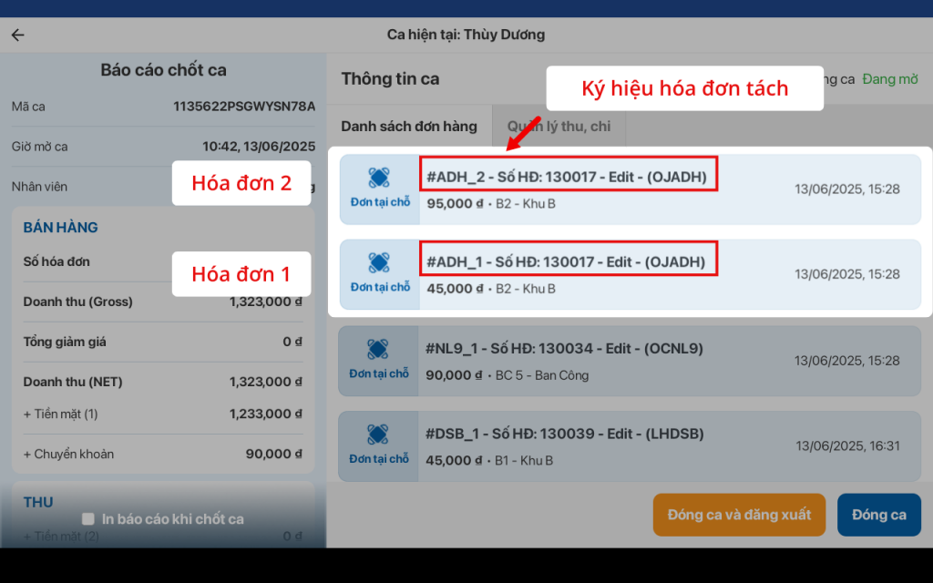 VD: Bạn cần tách đơn sau thành 2 hóa đơn, điều chỉnh số lượng → Bấm Lưu